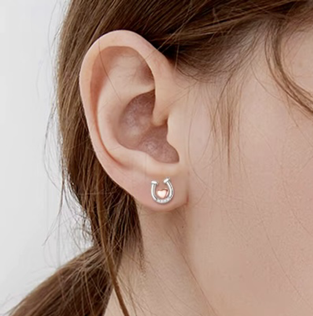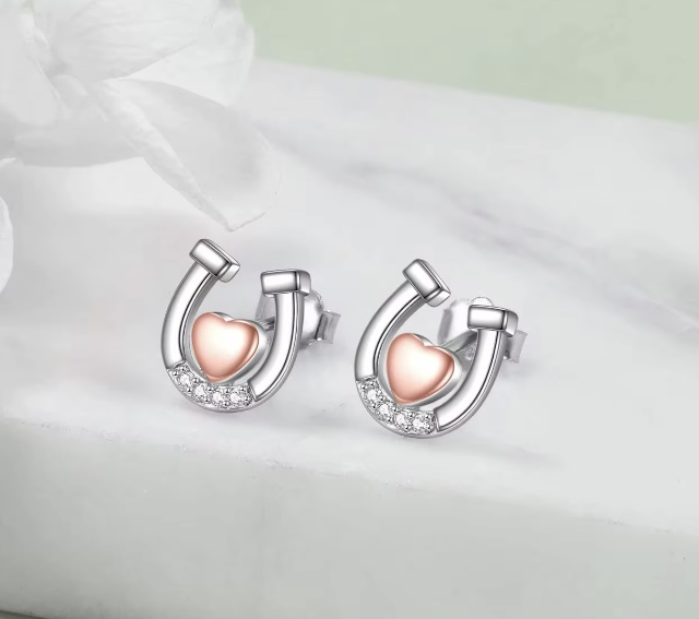 925 Silver Plated Horseshoe Stud Earrings with Rose Gold Plated Heart and Cubic Zircona