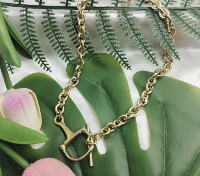 Show off your passion for horses with our Chunky Snaffle Bit Necklace, available in both Silver and Gold colors. This statement piece is simple to wear and easy to do up/undo, making it perfect for everyday use. This striking necklace is a must-have for any horse lover looking to add a touch of equestrian style to their outfit. Make a bold statement and elevate your look with this chic and stylish accessory.
